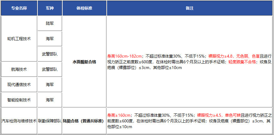 2.身体条件:我校2025年军士生招生专业体检要求有2个标准:①陆勤合格,即“普通兵”军检合格;②水面舰艇合格,即“条件兵”军检合格。相对而言水面舰艇人员的体检要求更高,请注意水面舰艇合格和陆勤合格体检指标的差异。具体可参看全国征兵网“《应征公民体格检查标准》摘要”(网址:https://www.gfbzb.gov.cn/zbbm/zcfg/byfg/tjbz.shtml)。以下所列条件可进行初步判断,仅供参考!
