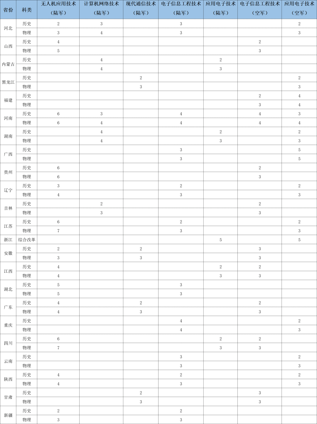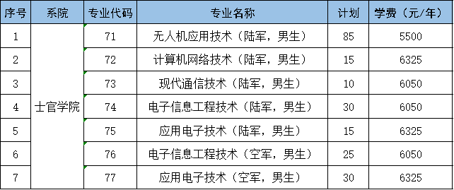 自2014年开展定向培养军士工作以来,学校已为陆军、空军、战略支援部队和消防救援队伍培养入伍军士4900余名。在校军士生1800余名,空军定向培养专业有电子信息工程技术、应用电子技术专业,陆军定向培养专业有计算机网络技术、现代通信技术、无人机应用技术、电子信息工程技术、应用电子技术等专业,学校定向军士年度招生计划、在校生规模和人才培养质量均位居全国同类院校前列。